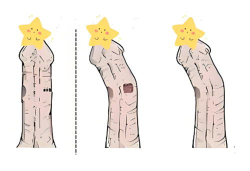 向一侧偏斜:阴茎整体向左侧或右侧偏离中轴线,勃起时偏斜更显著,可能影响排尿方向和性生活插入角度。